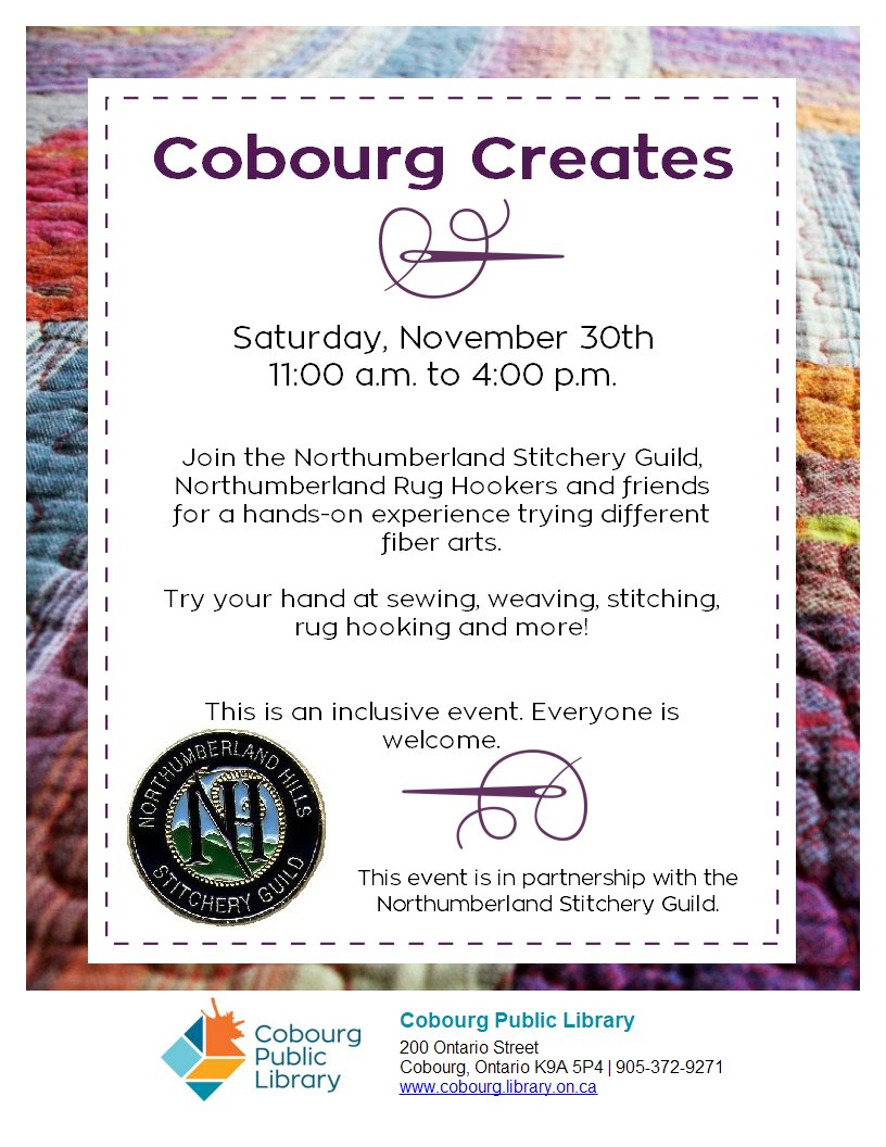 The Cobourg Public Library held its first "Cobourg Creates" Day, in conjunction with the Northumberland Hills Stitchery Guild, on 30 November, 2024.