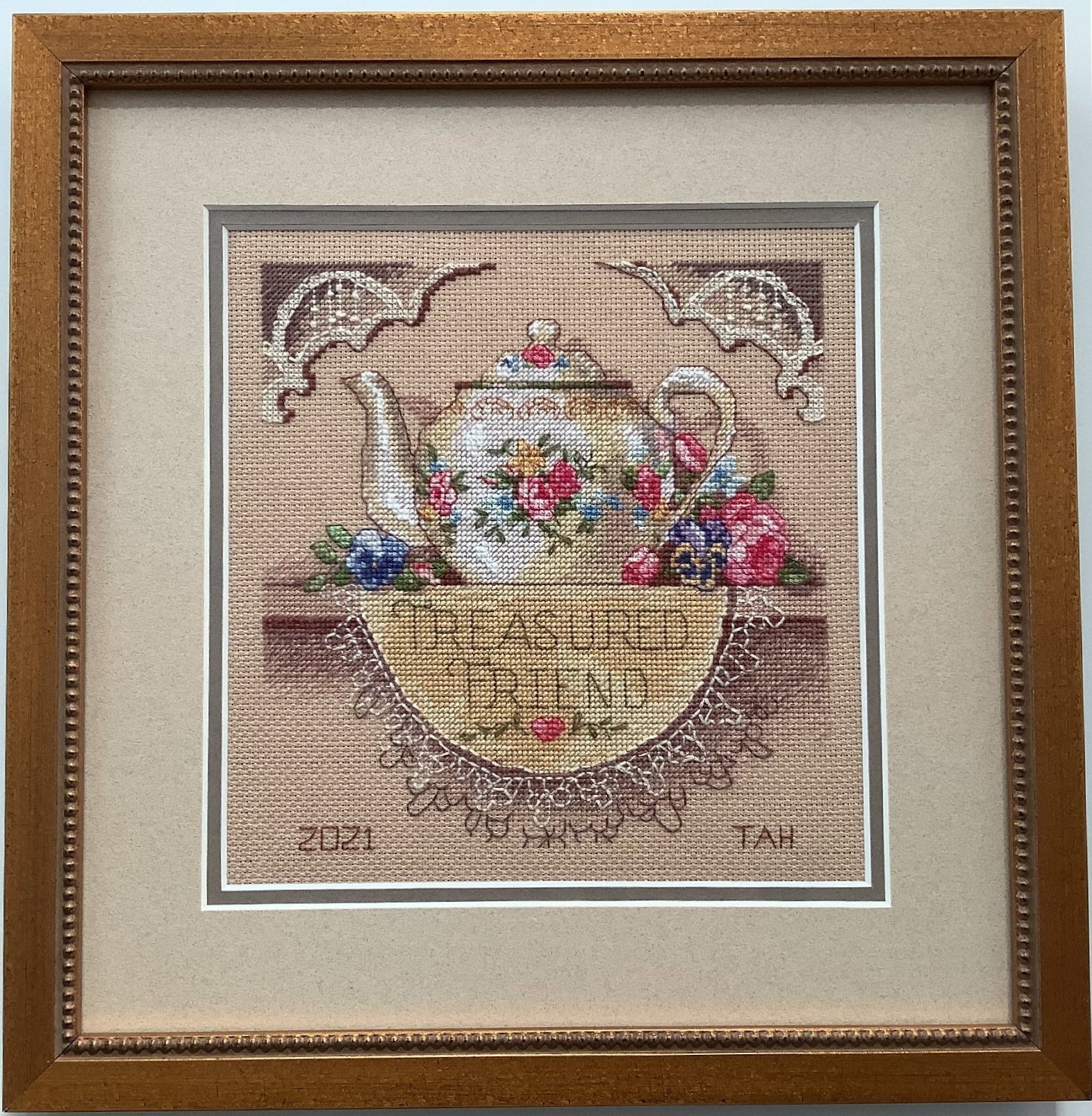 A UFO project - from a very old Kit "Pansy Teacup" (Candamar Designs, Inc. circa 1990s - now $17.00 on Etsy) started by someone else, which I inherited, and finally finished. However, after some excellent framing by Kim Mather it now joins a similar project I also finished a few years ago. |